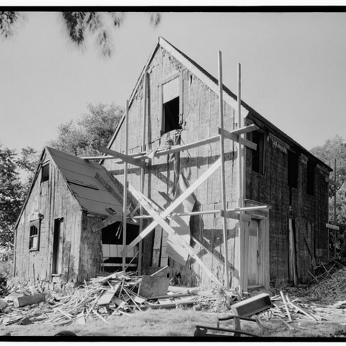 The three century old house on Shawme Pond in Sandwich is being repaired by the town and Sandwich Historical Society. Plans are to have it open for next summer, with period furnishings. Mr. Arnold's picture shows the heavy vertical pine siding. Mr. Masaschi and his men are starting by replacing the sills. Already they have found a room and a fireplace not previously known. On the committee for the restoration are Channing E. Hoxie, chairman, Gilbert Smith, George Sutton and William Russell Jr. - The Falmouth Enterprise August 29, 1959